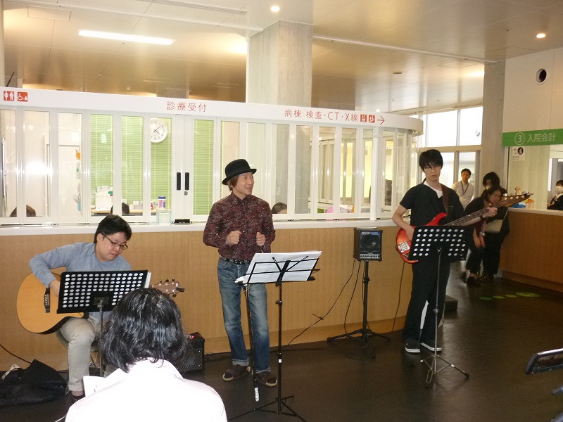今回のコンサートでは江里口(音楽療法士)によるピアノと、医局の谷口医師によるギターと廣瀬医師によるベースの演奏に合わせて、藤岡副院長が「あの素晴しい愛をもう一度」や「心の旅」など誰もが聴いたことのある、懐かしい曲を全部で4曲を熱演しました。