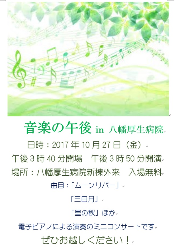 八幡厚生病院にてピアノ演奏会「音楽の午後 in 八幡厚生病院」が開催されます。